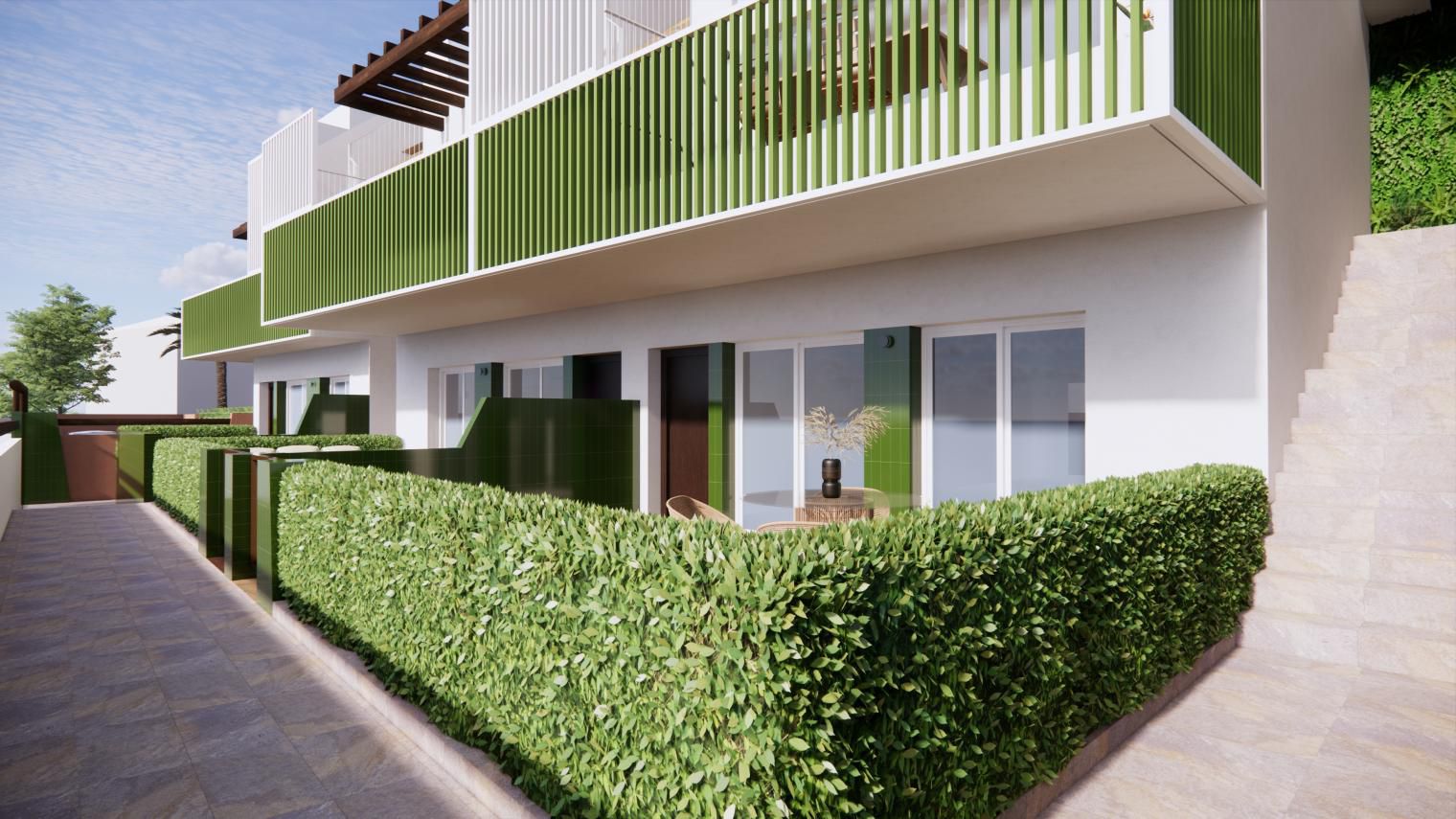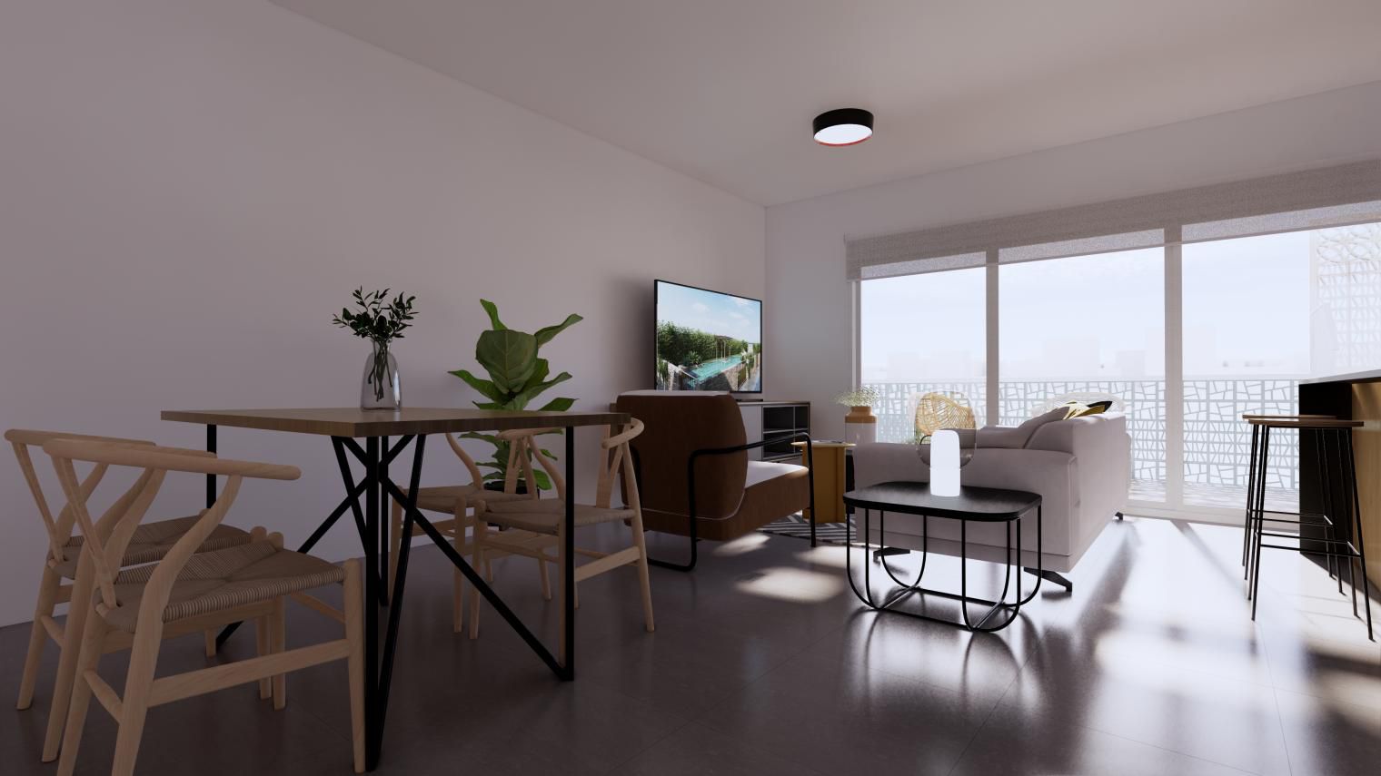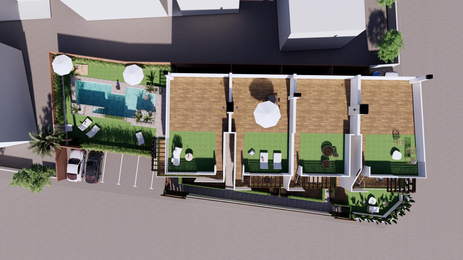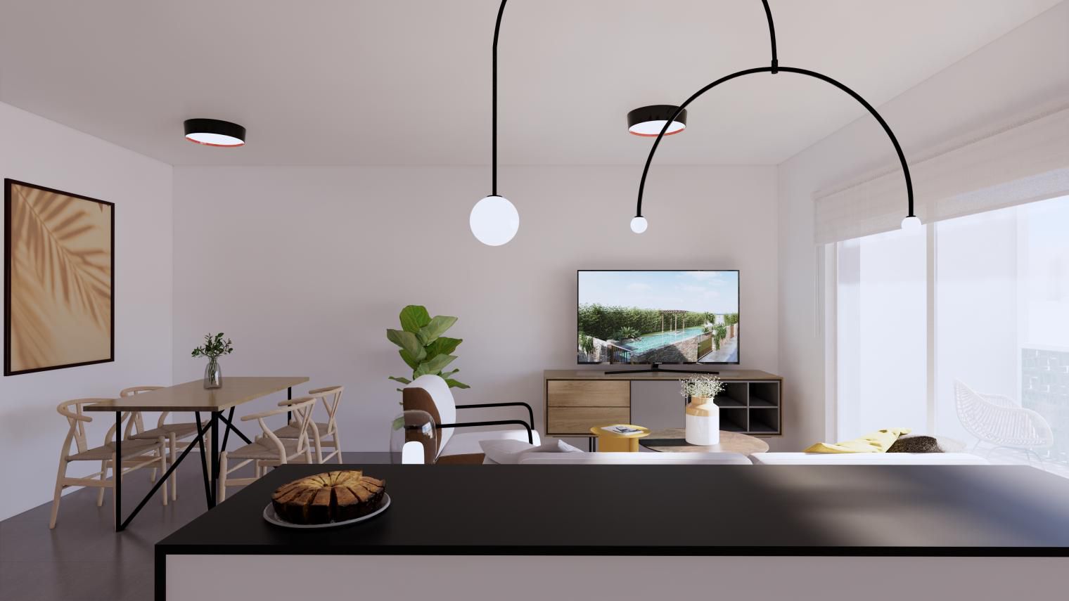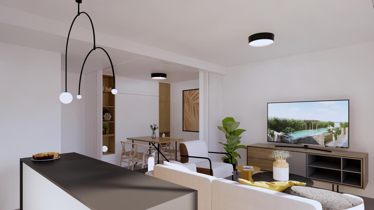 Es de diseño vanguardista y consta de dos dormitorios y dos baños. Así como parking y piscina comunitaria. Tiene 75 m2 construidos y una terraza de 12m2.