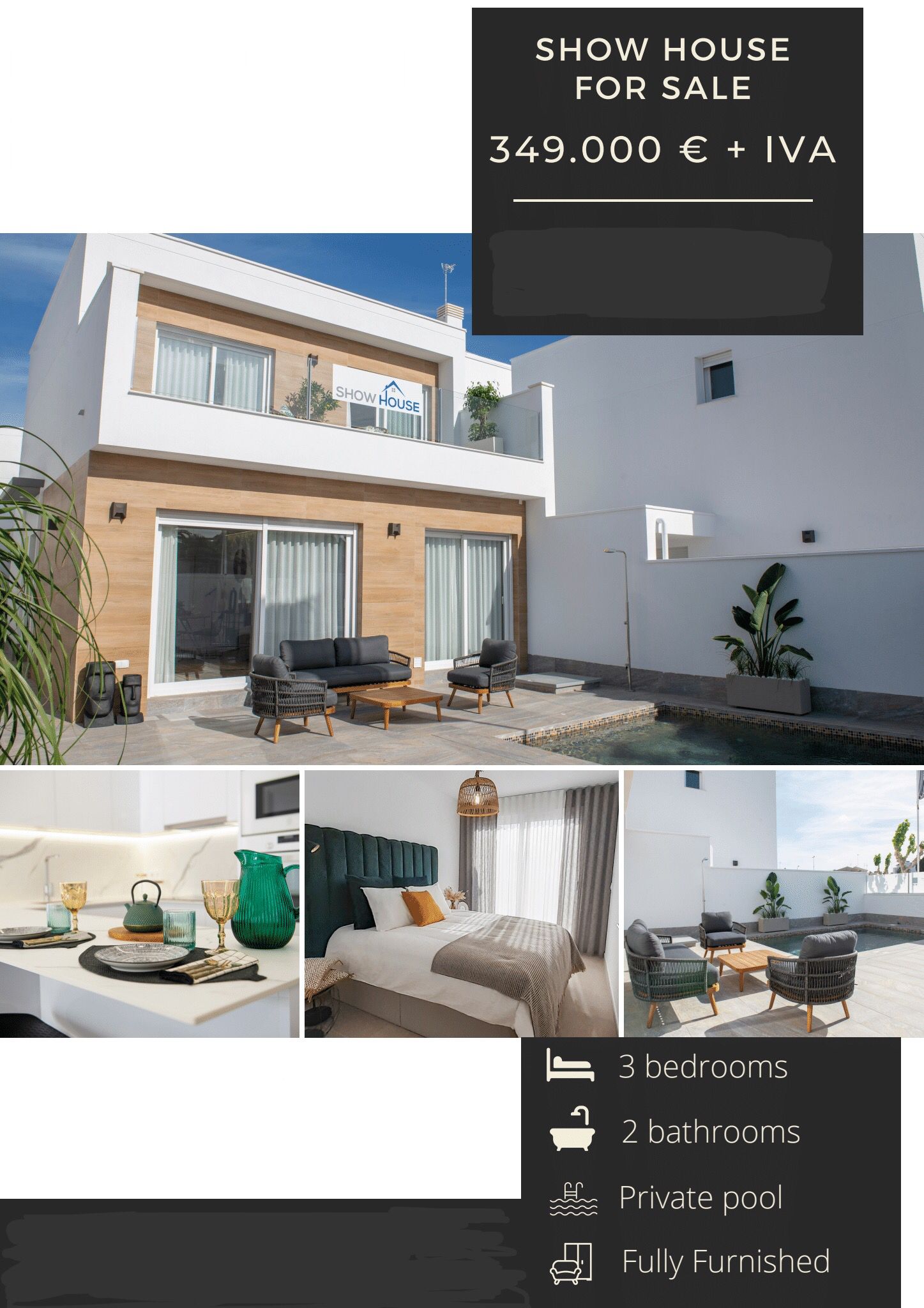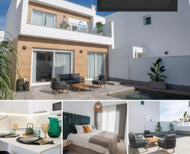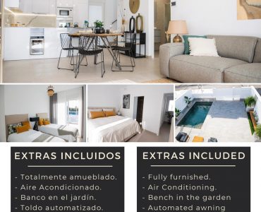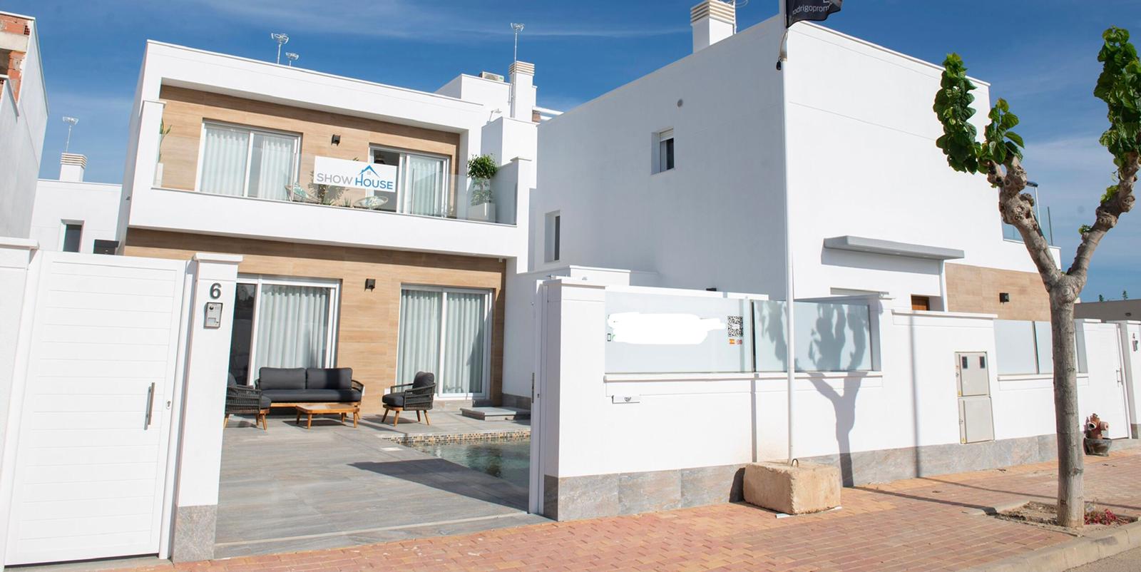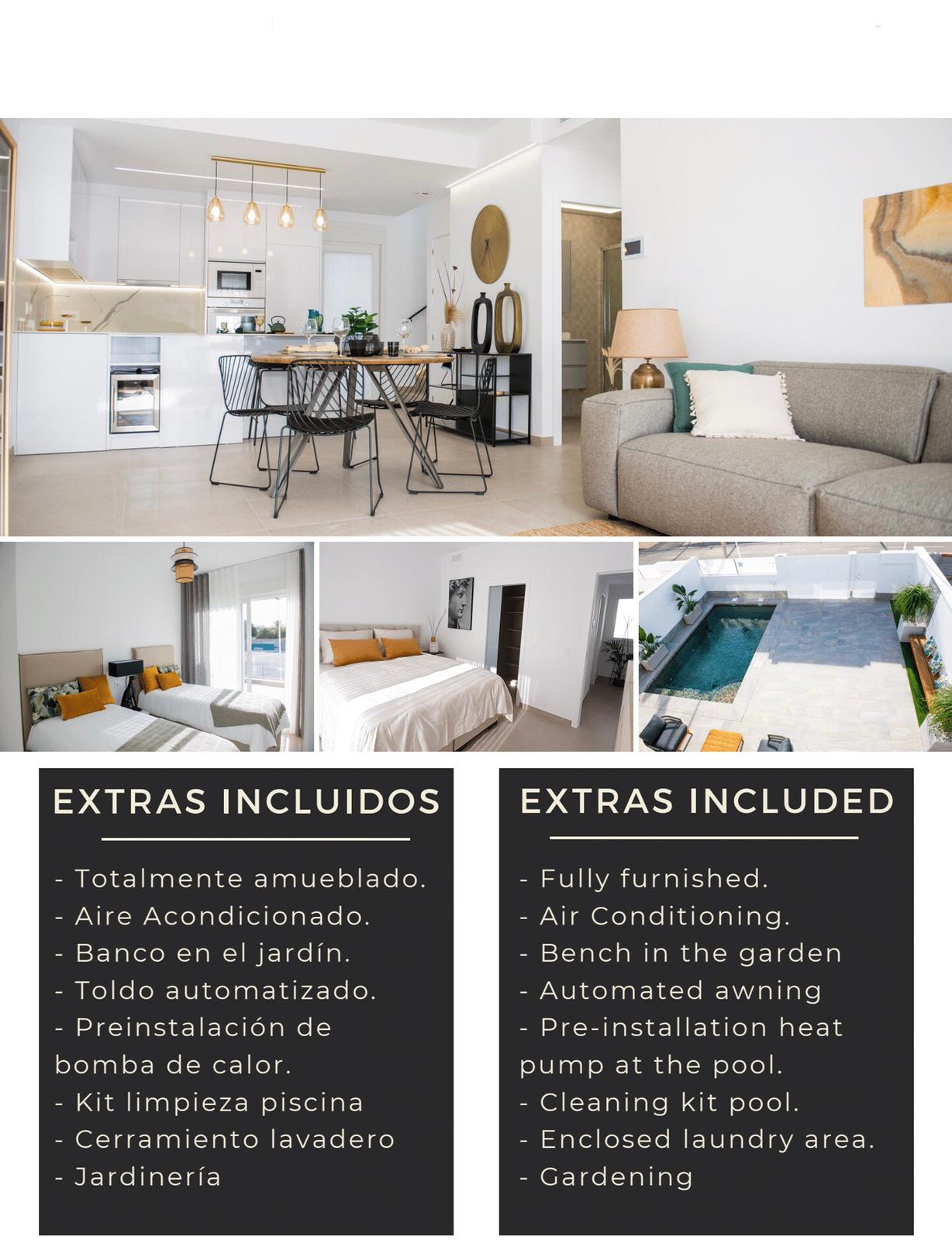 Aire Acondicionado, Banco en el jardín, toldo automatizado, preinstalación de bomba de calor, kit limpieza piscina, cerramiento lavadero y jardinería. Esto es lo que incluye esta vivienda adosada de nueva construcción, en una urbanización tranquila y a solo 5 minutos de las playas de La Llana en el Mar Mediterráneo y de las playas del Mar Menor en Lo Pagán, Costa Cálida.