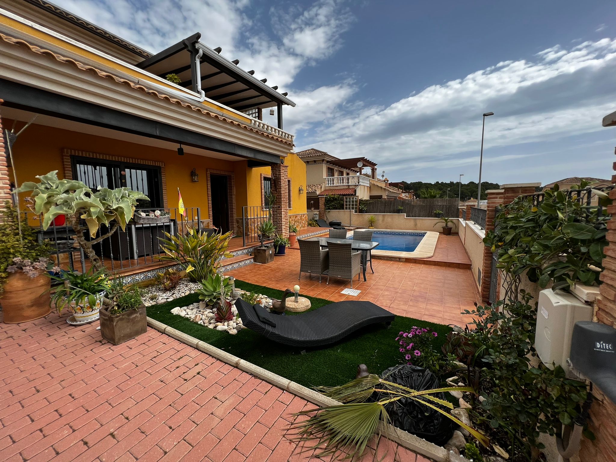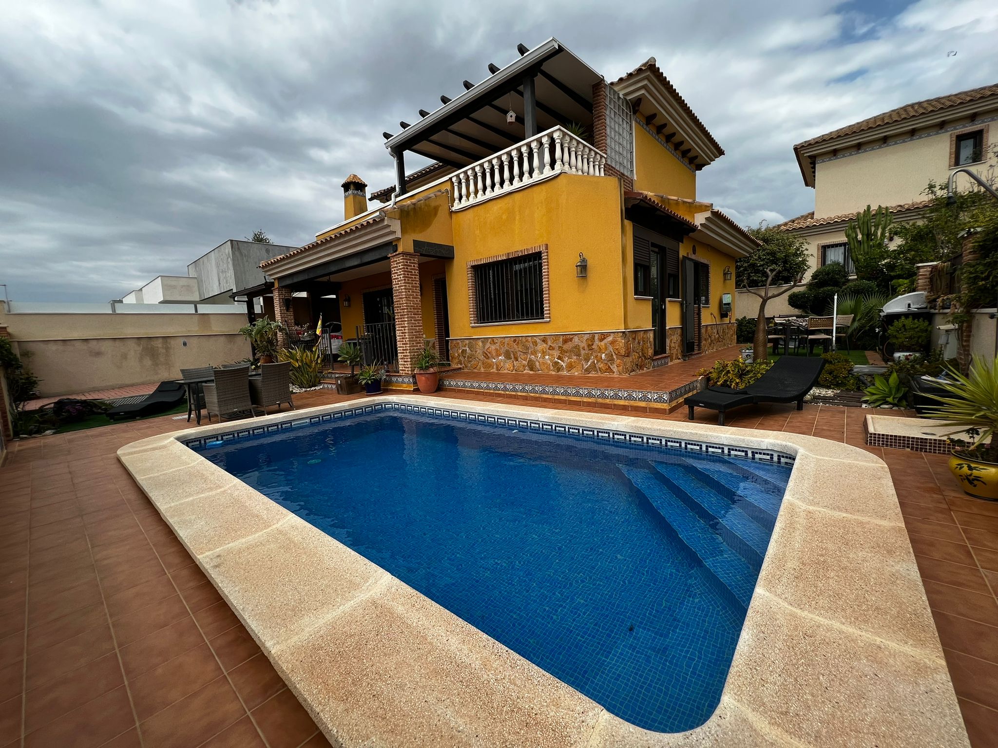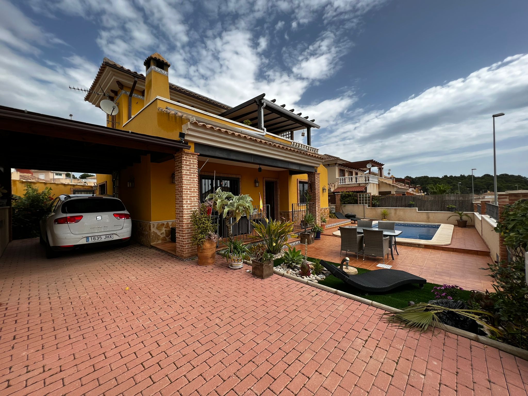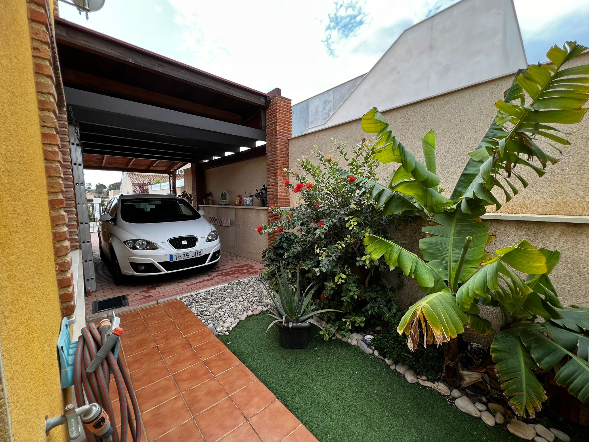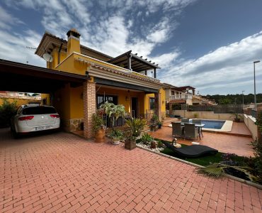 Outside, we have a beautiful well-equipped garden with different spaces, such as the covered terrace in front of the house, the 7×3 pool, 1 small barbecue area near the kitchen exit, a laundry room, a storage room.