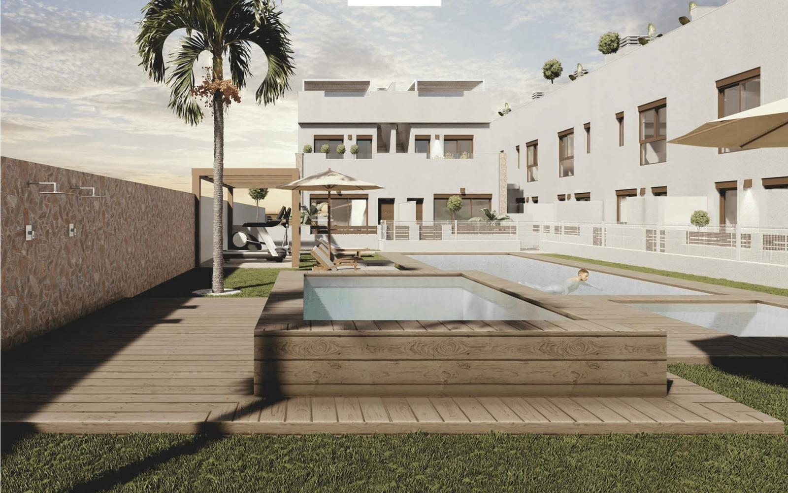 They have 3 bedrooms, 2 bathrooms, open kitchen, living room with direct access to the cozy pool area, rear terrace with parking space, terrace and large roof terrace.