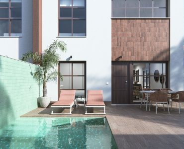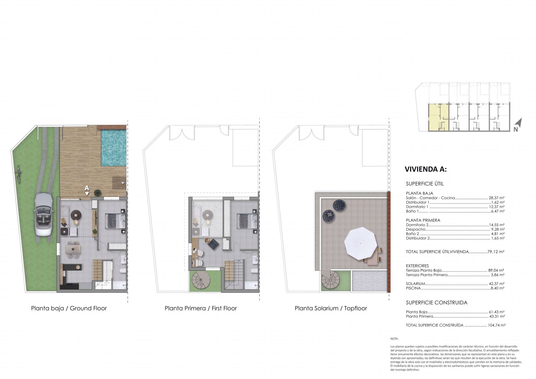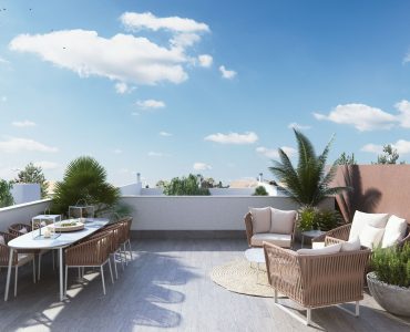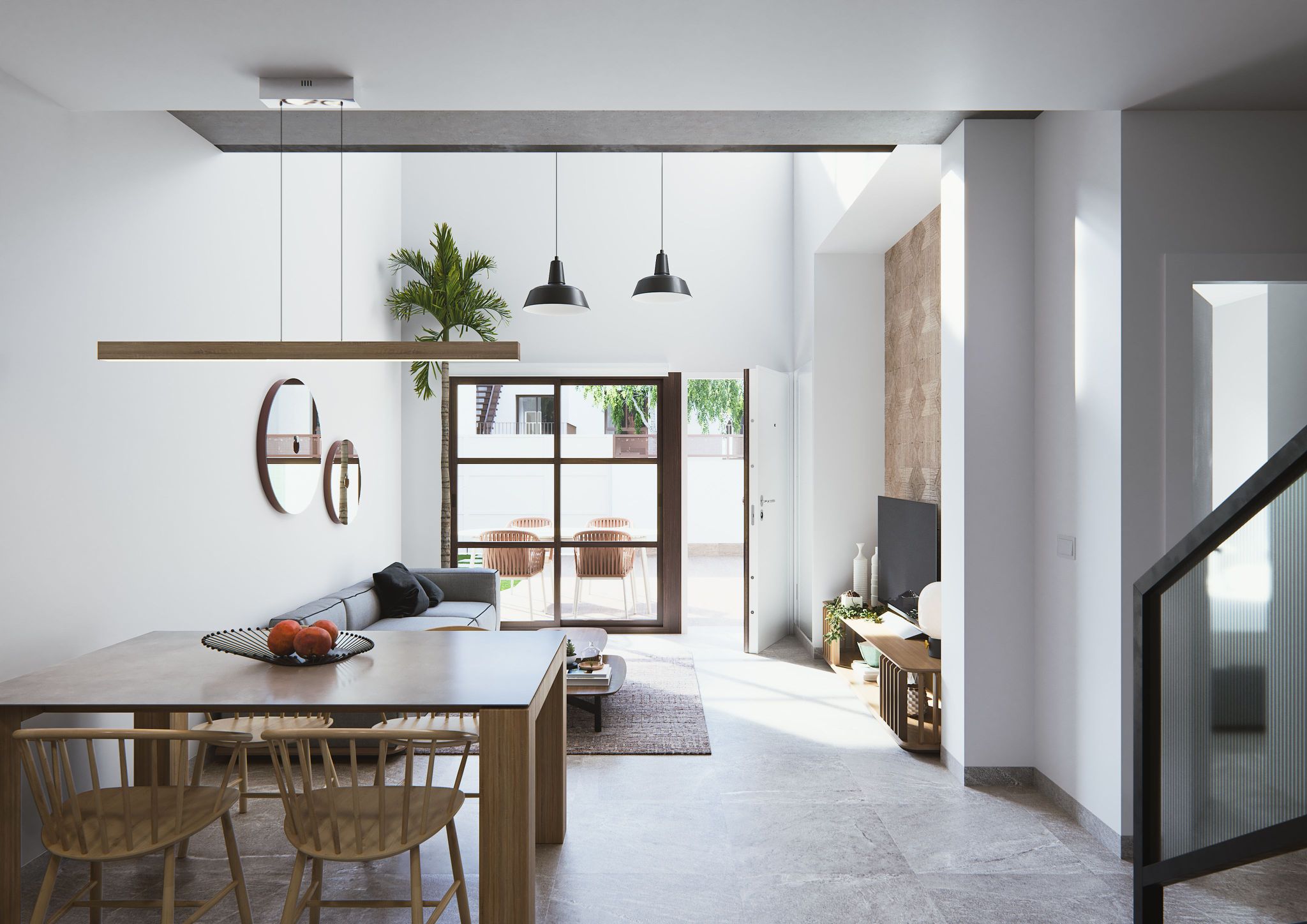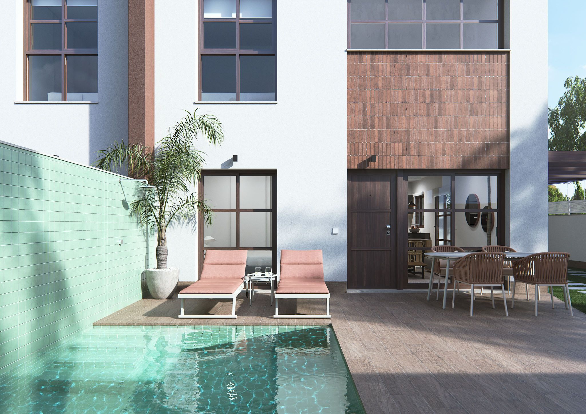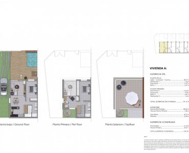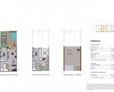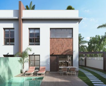 These townhouses will have 3 bedrooms, 2 bathrooms and a private solarium. On the ground floor there will be an open plan kitchen and dining room, doors leading out to the private pool and garden, 1 bedroom and family bathroom. On the upper floor there is another bedroom, 3rd room for office or extra bedroom, terrace, bathroom and stairs leading to the solarium.