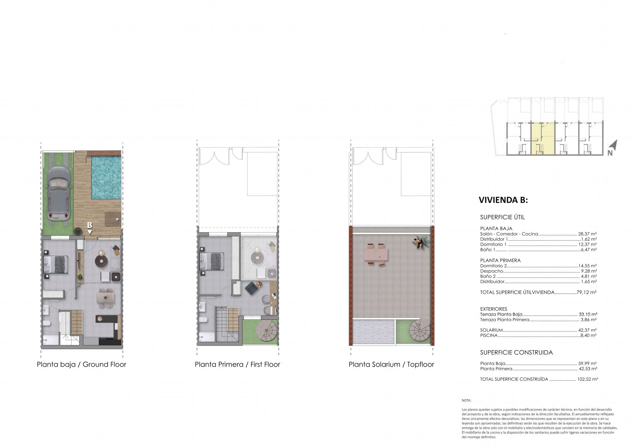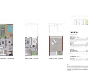 Type Townhouse Status New construction, SOLD Location Alicante Sub Location Pilar de la Horadada Price €259,000.00 Area 102 m Bedrooms 3 Bathrooms 2 Reference 0027 Area 102 Ground area 33,26 Solarium 42,37